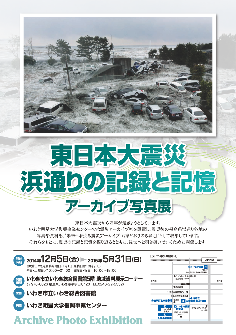 以前よりご案内しておりました、いわき総合図書館主催、いわき明星大学復興事業センター共催【東日本大震災 浜通りの記録と記憶 アーカイブ写真展】が、本日平成26年12月5日(金)よりスタートいたしました。